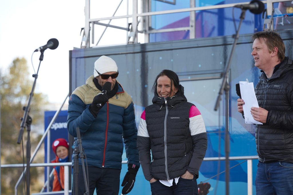 Disse utøverne får utdelt sitt startnummer på scenen ved Geilohallen, der Ole Kristian Stoltenberg styrer showet.